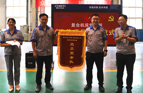 下午3点,仪式正式开始,党委书记、董事长刘德永为复合机床党支部授旗,复合机床党支部书记梅镇接旗。